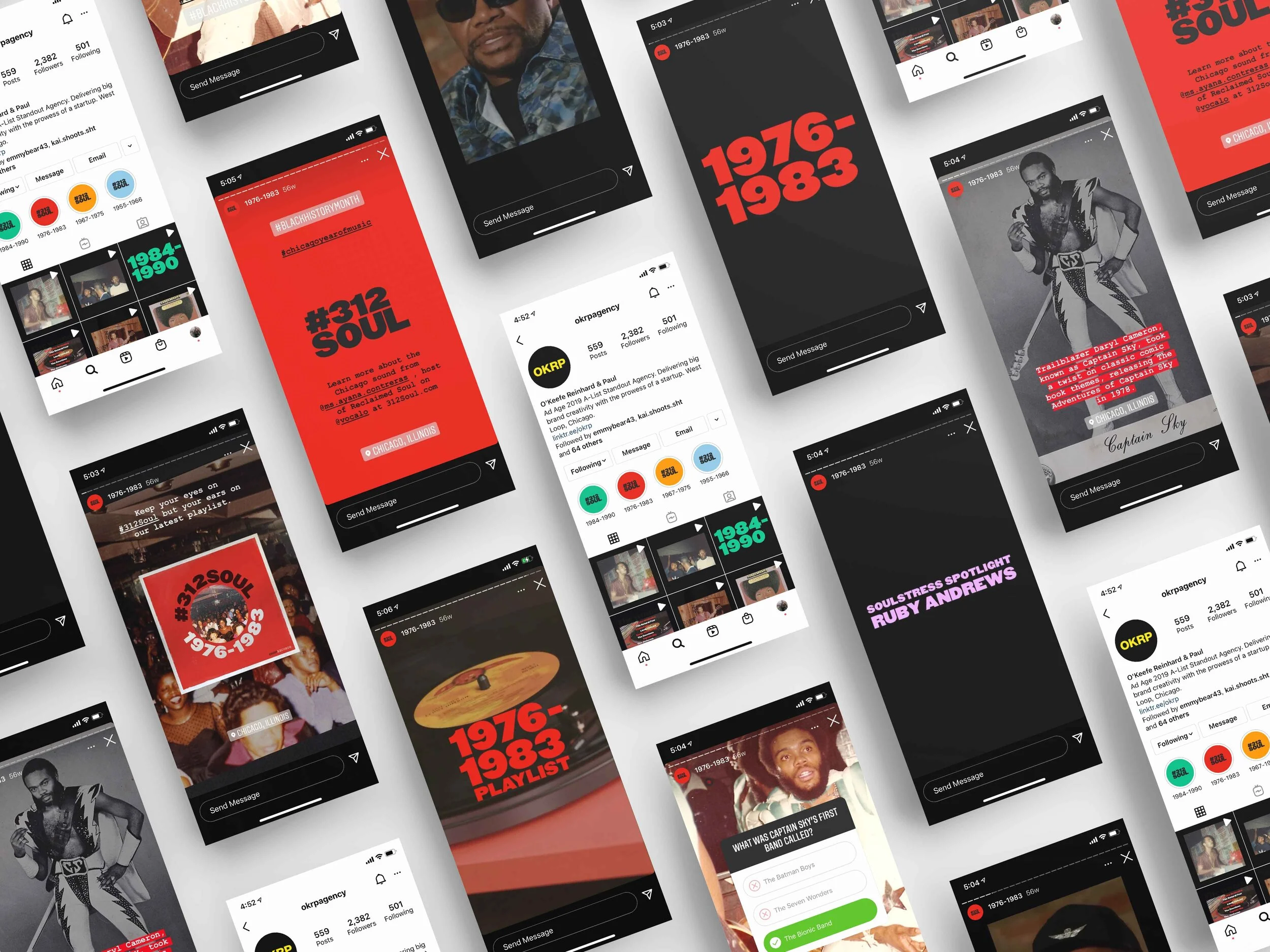 While using the OKRP instagram page to promote #312SOUL, it was important to design a look/ feel that would separate its content from OKRP’s, plus, give it an immediate tone that something exciting and new was happening here. The solution was to frame all content within a bold black background to give off a vintage scrapbook / archival feel but in a sleek and contemporary way. A total of 22 original videos and 102 stories were created through-out the series.